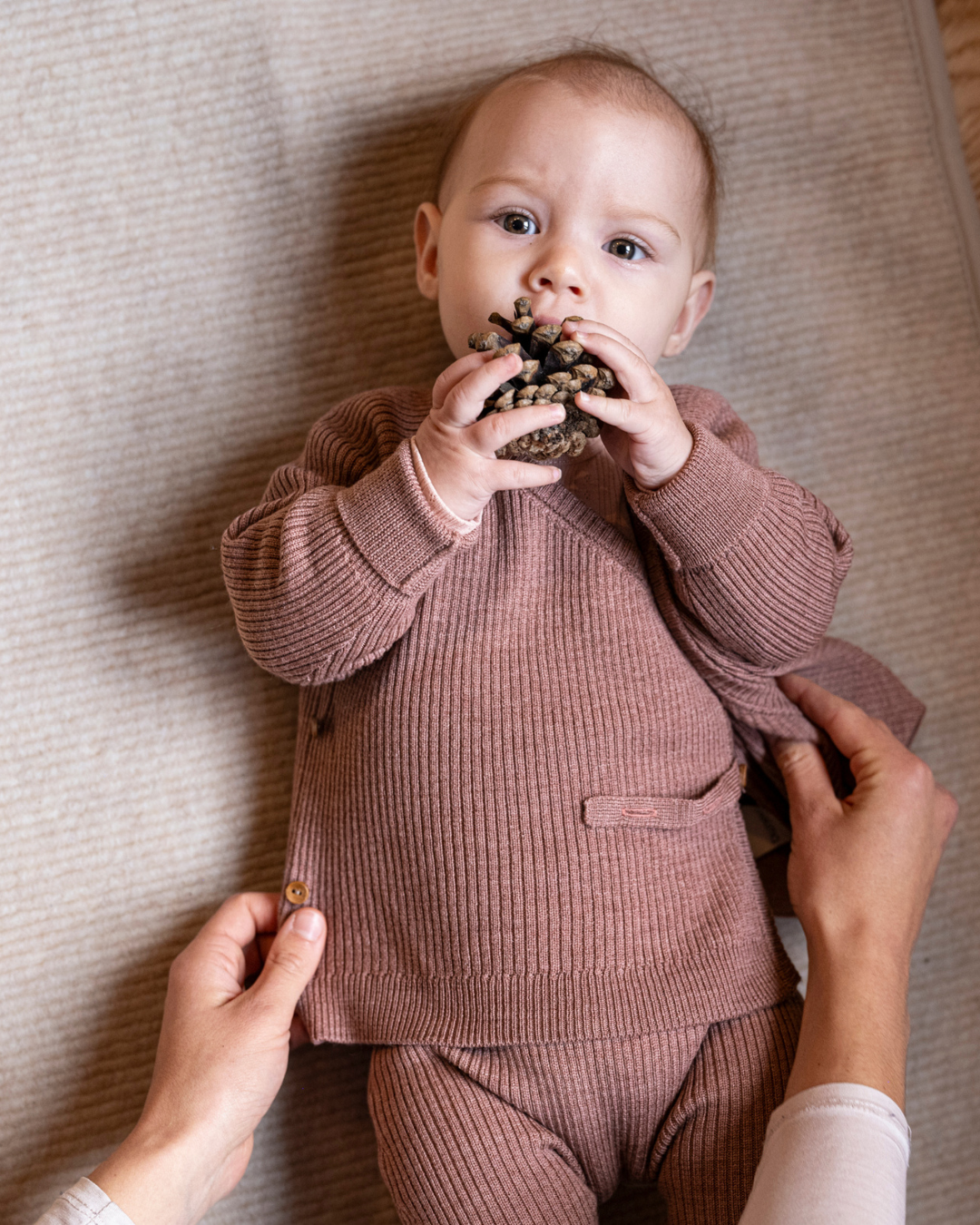 Für unsere Strickprodukte haben wir bewusst Merinowolle gewählt, weil keine andere Faser so viele natürliche Superkräfte hat. Diese sorgen dafür, dass sich dein Baby rundum wohlfühlt und schenken ihm das Vertrauen und die Sicherheit, die es für einen sanften Start in die ersten Lebensmonate braucht.